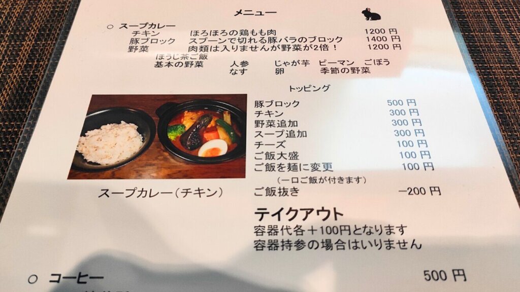 スープカレーは、定番の「チキン」「豚ブロック」「野菜」の3種類。